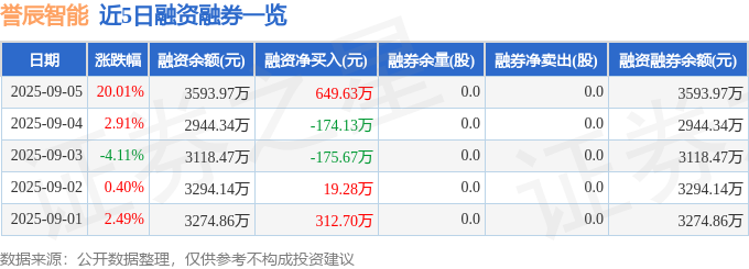 誉辰智能融资融券信息显示,融资方面,当日融资买入1975.13万元,融资偿还1325.5万元,融资净买入649.63万元。融券方面,融券卖出0.0股,融券偿还0.0股,融券余量0.0股,融券余额0.0万元。融资融券余额3593.97万元。