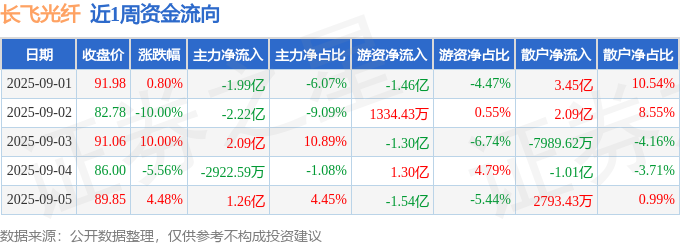 资金流向数据方面,本周长飞光纤主力资金合计净流出1.15亿元,游资资金合计净流出2.87亿元,散户资金合计净流入4.02亿元。本周资金流向一览见下表: