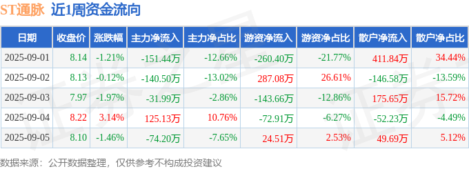 资金流向数据方面,本周ST通脉主力资金合计净流出272.99万元,游资资金合计净流出165.38万元,散户资金合计净流入438.37万元。本周资金流向一览见下表: