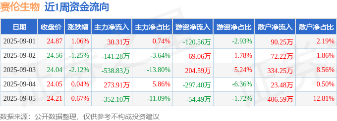 资金流向数据方面,本周赛伦生物主力资金合计净流出727.99万元,游资资金合计净流出198.79万元,散户资金合计净流入926.78万元。本周资金流向一览见下表:
