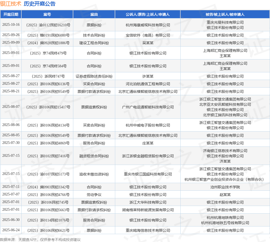 案号:(2024)冀0928民初1886号根据统计,近一年内以银江技术股份有限公司为当事人的历史开庭公告有100则,其中案由为“劳动争议”的公告以14则居首,其次为“票据追索权纠纷”有12则,“合同纠纷”有11则。历史开庭公告(前20条)如下: