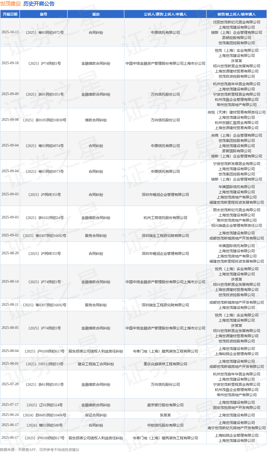 案号:(2025)浙01民初1051号根据统计,近一年内以上海世茂建设有限公司为当事人的历史开庭公告有76则,其中案由为“金融借款合同纠纷”的公告以28则居首,其次为“合同纠纷”有10则,“借款合同纠纷”有7则。历史开庭公告(前20条)如下: