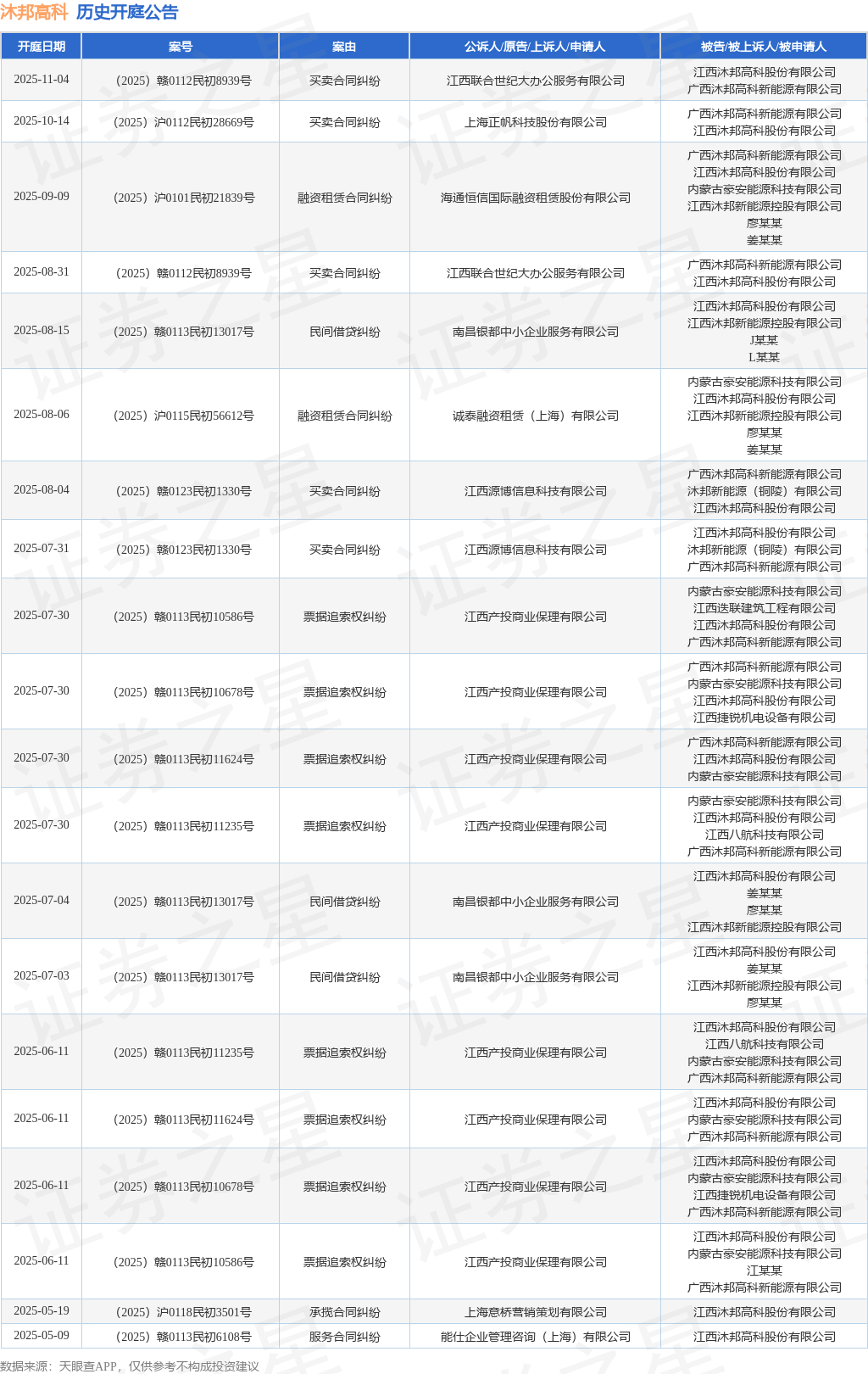 案号:(2025)沪0101民初21839号根据统计,近一年内以江西沐邦高科股份有限公司为当事人的历史开庭公告有24则,其中案由为“票据追索权纠纷”的公告以8则居首,其次为“买卖合同纠纷”有7则,“民间借贷纠纷”有3则。历史开庭公告(前20条)如下: