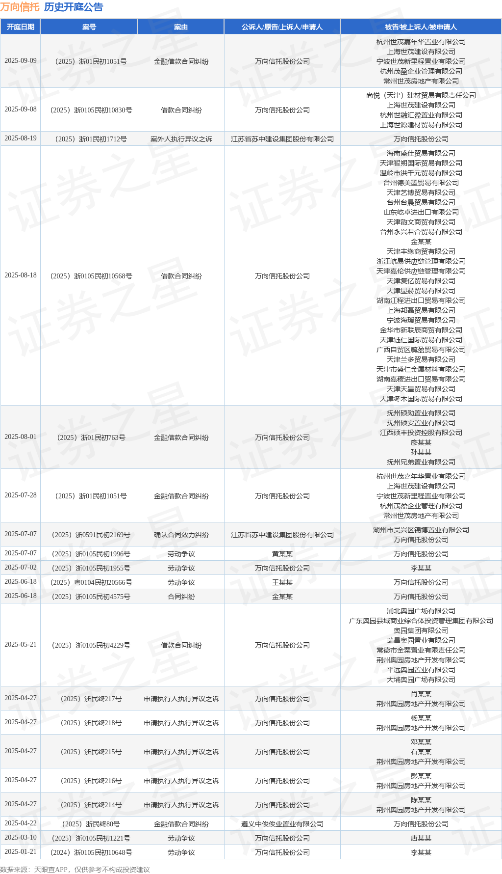案号:(2025)浙01民初1051号根据统计,近一年内以万向信托股份公司为当事人的历史开庭公告有47则,其中案由为“申请执行人执行异议之诉”的公告以9则居首,其次为“劳动争议”有8则,“金融借款合同纠纷”有7则。历史开庭公告(前20条)如下: