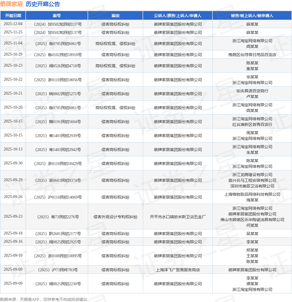 案号:(2025)闽0825民初2230号根据统计,近一年内以箭牌家居集团股份有限公司为当事人的历史开庭公告有531则,其中案由为“侵害商标权纠纷”的公告以458则居首,其次为“商标权权属、侵权纠纷”有24则,“不正当竞争纠纷”有8则。历史开庭公告(前20条)如下: