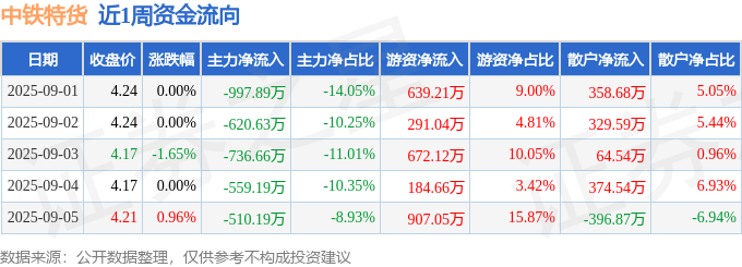 资金流向数据方面,本周中铁特货主力资金合计净流出3424.56万元,游资资金合计净流入2694.07万元,散户资金合计净流入730.49万元。本周资金流向一览见下表: