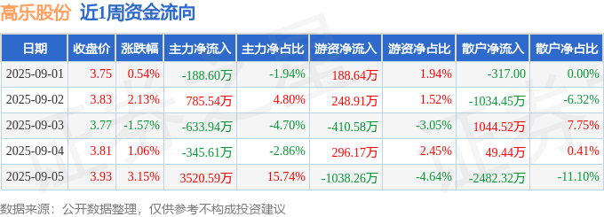 资金流向数据方面,本周高乐股份主力资金合计净流入3137.97万元,游资资金合计净流出715.13万元,散户资金合计净流出2422.85万元。本周资金流向一览见下表: