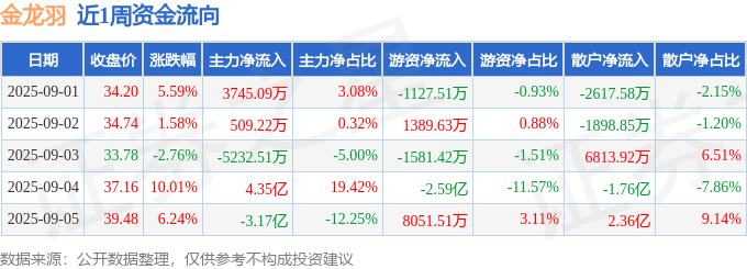 资金流向数据方面,本周金龙羽主力资金合计净流入1.08亿元,游资资金合计净流出1.92亿元,散户资金合计净流入8335.61万元。本周资金流向一览见下表: