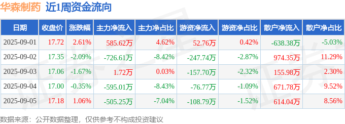 资金流向数据方面,本周华森制药主力资金合计净流出1239.53万元,游资资金合计净流出538.23万元,散户资金合计净流入1777.77万元。本周资金流向一览见下表: