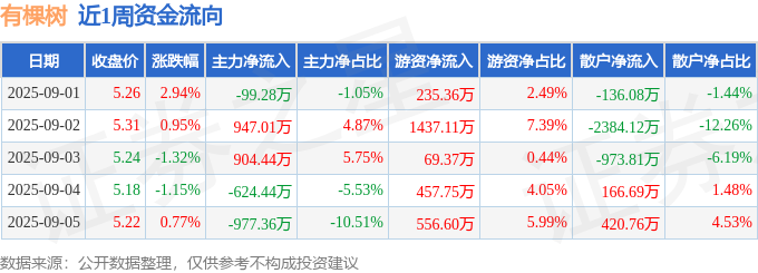 资金流向数据方面,本周有棵树主力资金合计净流入150.37万元,游资资金合计净流入2756.2万元,散户资金合计净流出2906.57万元。本周资金流向一览见下表: