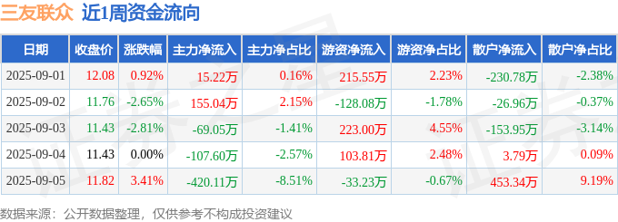 资金流向数据方面,本周三友联众主力资金合计净流出426.5万元,游资资金合计净流入381.05万元,散户资金合计净流入45.45万元。本周资金流向一览见下表: