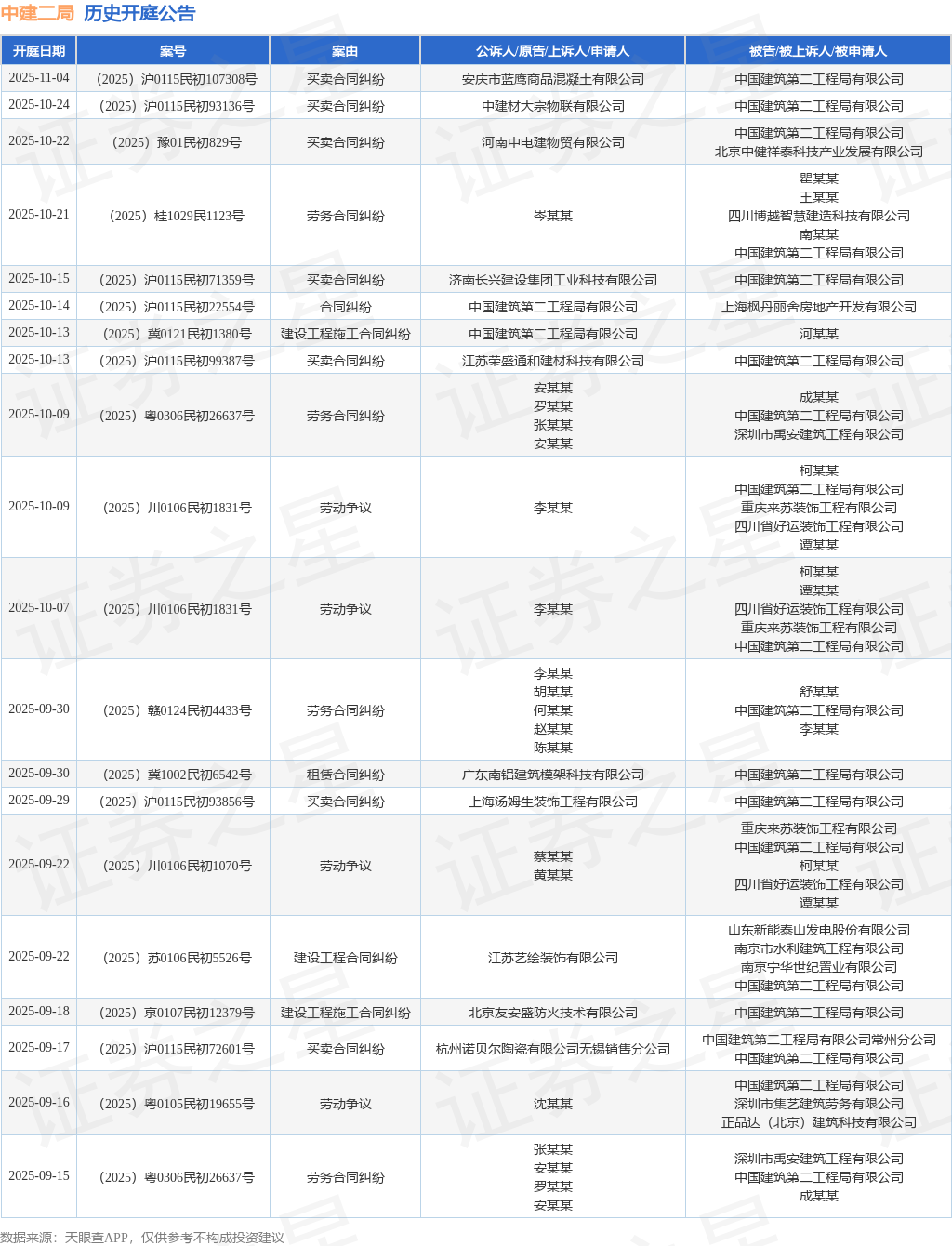 案号:(2025)冀0102民初8489号根据统计,近一年内以中国建筑第二工程局有限公司为当事人的历史开庭公告有2115则,其中案由为“买卖合同纠纷”的公告以618则居首,其次为“劳务合同纠纷”有288则,“建设工程施工合同纠纷”有260则。历史开庭公告(前20条)如下: