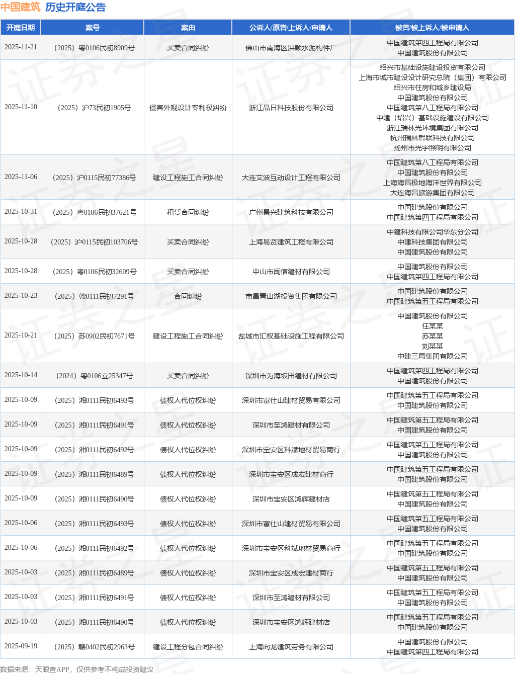 案号:(2025)闽0128民初5153号根据统计,近一年内以中国建筑股份有限公司为当事人的历史开庭公告有625则,其中案由为“买卖合同纠纷”的公告以264则居首,其次为“建设工程施工合同纠纷”有73则,“建设工程分包合同纠纷”有63则。历史开庭公告(前20条)如下: