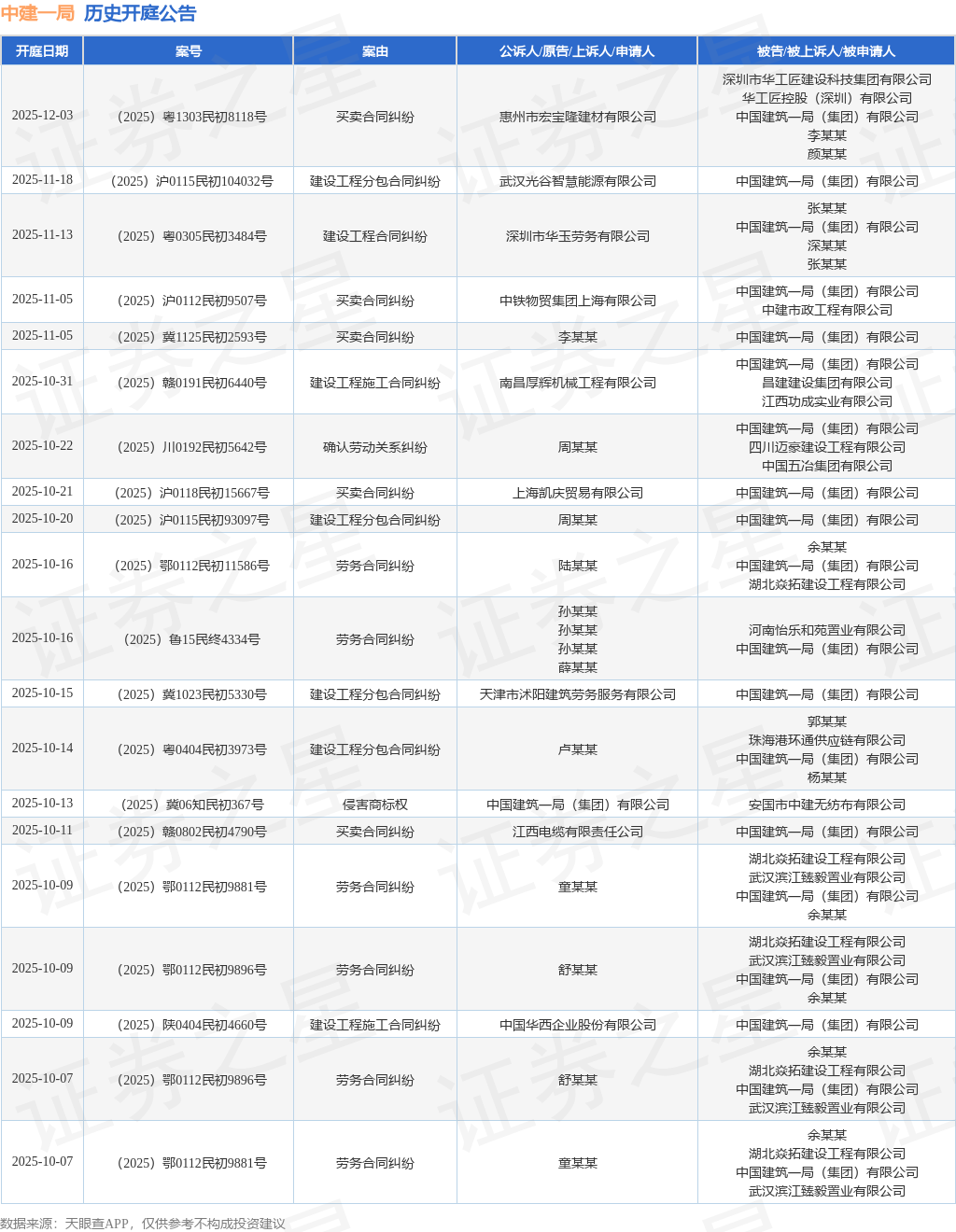 案号:(2025)苏0115民初17777号根据统计,近一年内以中国建筑一局(集团)有限公司为当事人的历史开庭公告有1418则,其中案由为“建设工程施工合同纠纷”的公告以389则居首,其次为“买卖合同纠纷”有195则,“建设工程分包合同纠纷”有186则。历史开庭公告(前20条)如下: