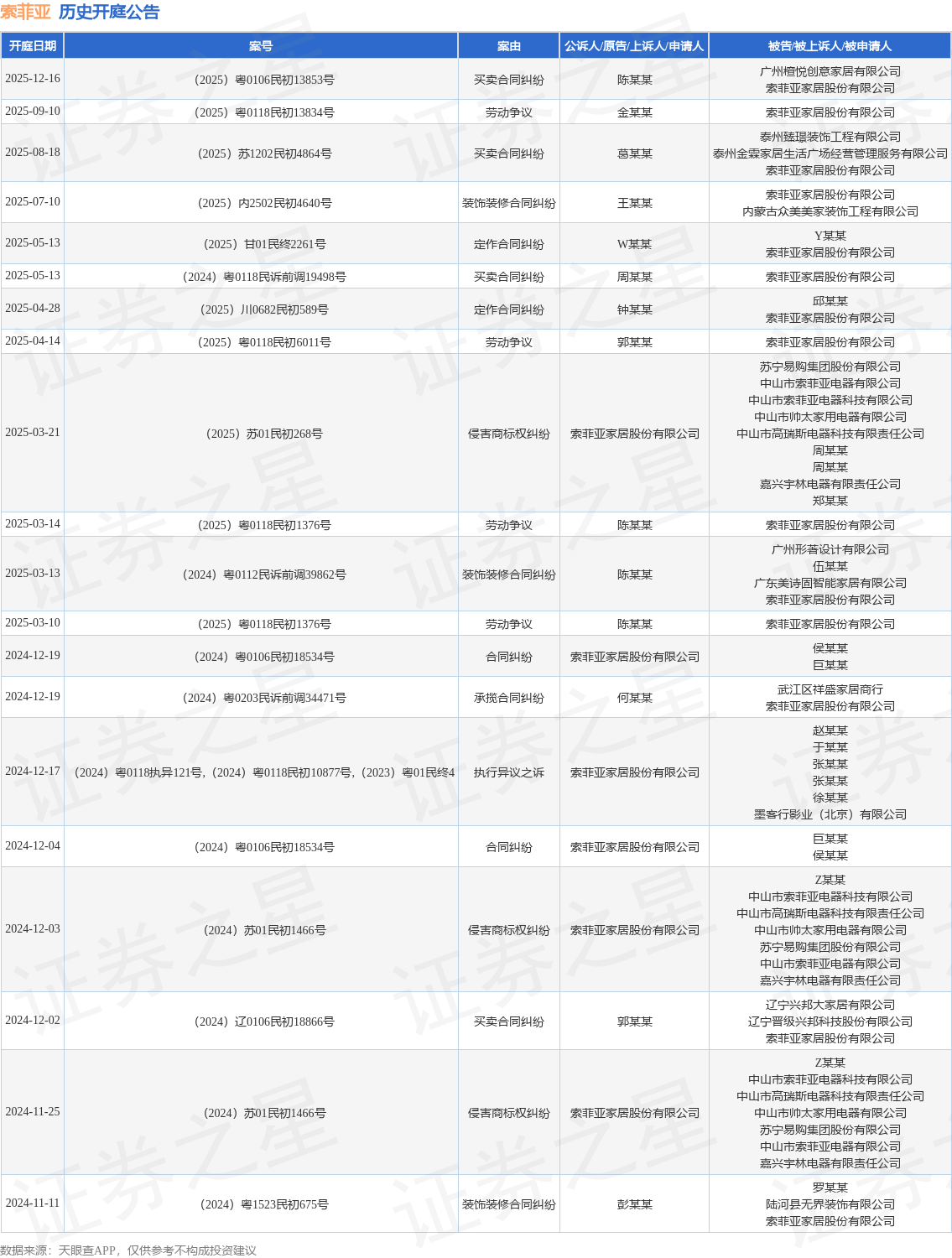 案号:(2025)粤0118民初13834号根据统计,近一年内以索菲亚家居股份有限公司为当事人的历史开庭公告有24则,其中案由为“买卖合同纠纷”的公告以5则居首,其次为“劳动争议”有4则,“合同纠纷”有4则。历史开庭公告(前20条)如下: