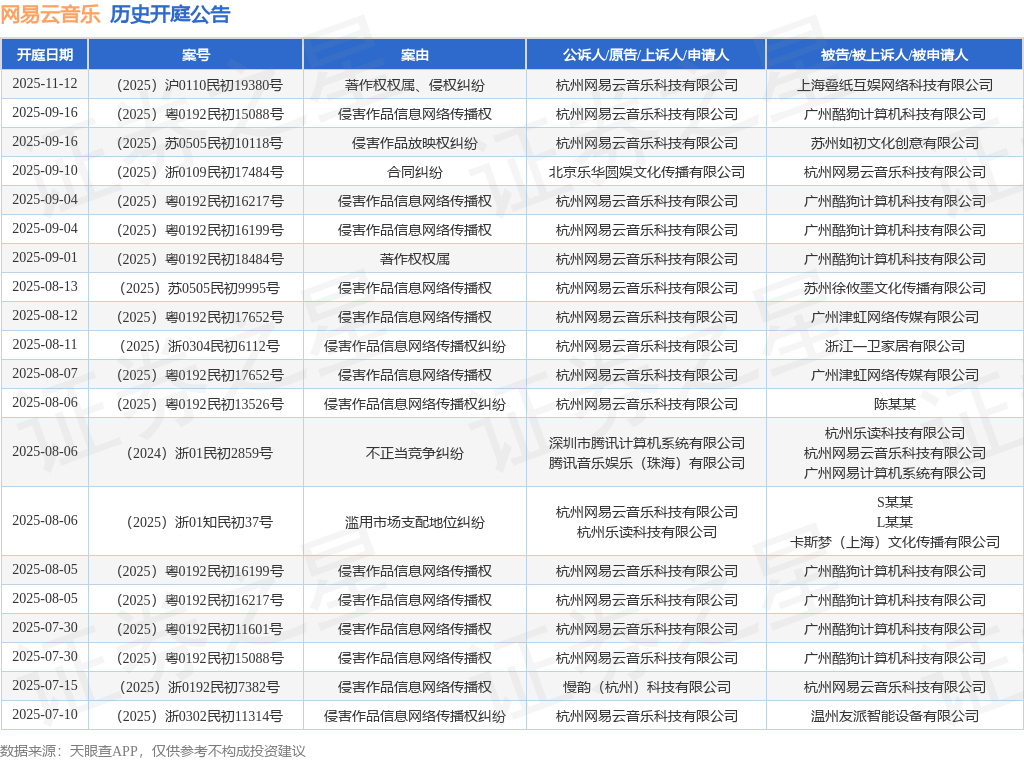 案号:(2025)浙0109民初17484号根据统计,近一年内以杭州网易云音乐科技有限公司为当事人的历史开庭公告有128则,其中案由为“侵害作品信息网络传播权纠纷”的公告以63则居首,其次为“著作权权属、侵权纠纷”有17则,“侵害作品信息网络传播权”有14则。历史开庭公告(前20条)如下: