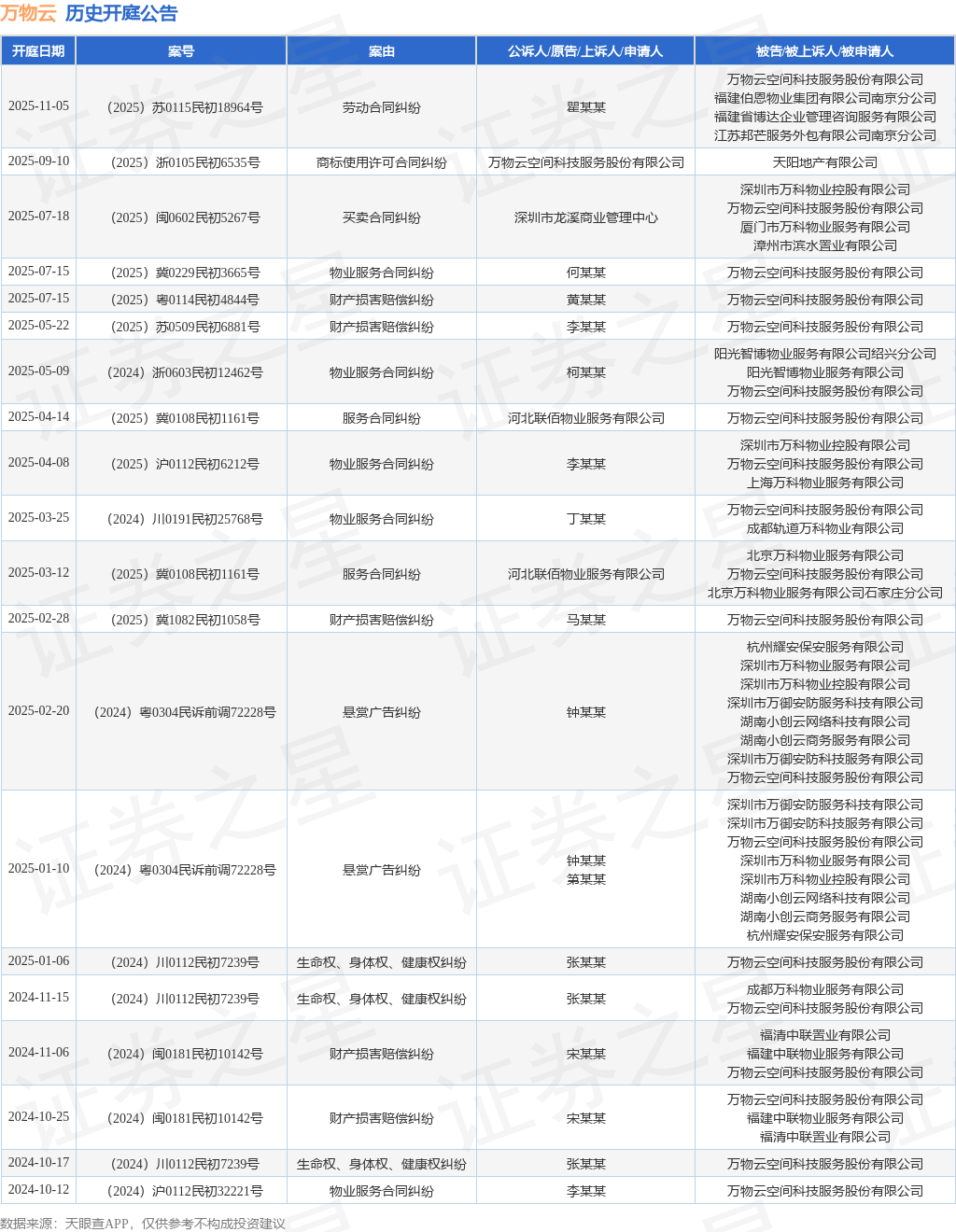 案号:(2025)浙0105民初6535号根据统计,近一年内以万物云空间科技服务股份有限公司为当事人的历史开庭公告有20则,其中案由为“物业服务合同纠纷”的公告以5则居首,其次为“财产损害赔偿纠纷”有5则,“生命权、身体权、健康权纠纷”有3则。历史开庭公告如下: