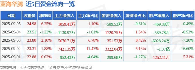 证券之星消息,截至2025年9月5日收盘,蓝海华腾(300484)报收于24.98元,上涨6.25%,换手率23.7%,成交量39.42万手,成交额9.6亿元。