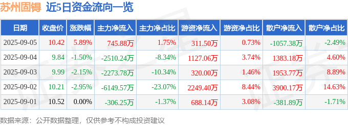 9月5日的资金流向数据方面,主力资金净流入745.88万元,占总成交额1.75%,游资资金净流入311.5万元,占总成交额0.73%,散户资金净流出1057.38万元,占总成交额2.49%。