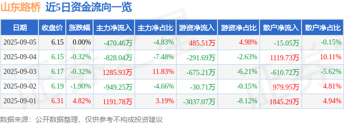 证券之星消息,截至2025年9月5日收盘,山东路桥(000498)报收于6.15元,上涨0.0%,换手率1.1%,成交量15.9万手,成交额9745.14万元。
