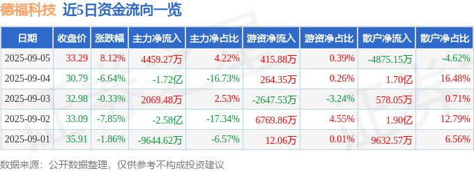 证券之星消息,截至2025年9月5日收盘,德福科技(301511)报收于33.29元,上涨8.12%,换手率8.71%,成交量32.62万手,成交额10.56亿元。