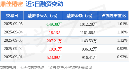 证券之星消息,9月5日,鼎佳精密(920005)融资买入458.28万元,融资偿还607.65万元,融资净卖出149.38万元,融资余额1012.28万元,近20个交易日中有13个交易日出现融资净买入。