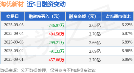 证券之星消息,9月5日,海优新材(688680)融资买入3593.15万元,融资偿还4340.12万元,融资净卖出746.97万元,融资余额2.63亿元。