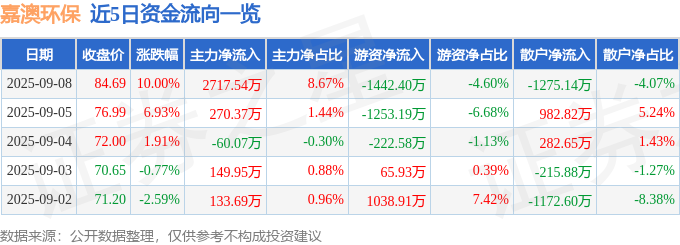 证券之星消息,截至2025年9月8日收盘,嘉澳环保(603822)报收于84.69元,上涨10.0%,涨停,换手率4.99%,成交量3.83万手,成交额3.13亿元。