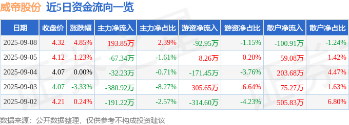 证券之星消息,截至2025年9月8日收盘,威帝股份(603023)报收于4.32元,上涨4.85%,换手率3.39%,成交量18.94万手,成交额8116.48万元。