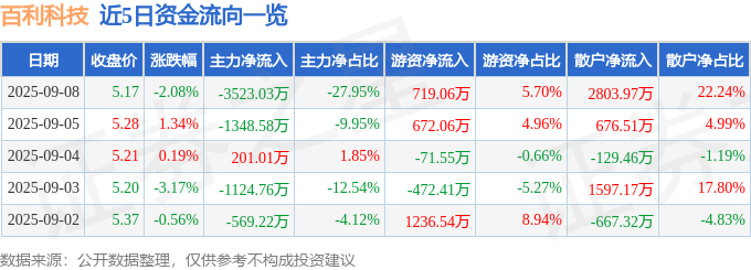 证券之星消息,截至2025年9月8日收盘,百利科技(603959)报收于5.17元,下跌2.08%,换手率4.95%,成交量24.27万手,成交额1.26亿元。