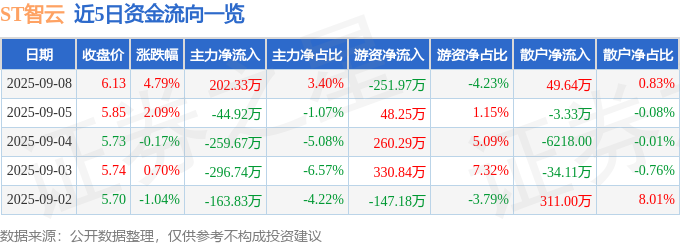 证券之星消息,截至2025年9月8日收盘,ST智云(300097)报收于6.13元,上涨4.79%,换手率3.66%,成交量9.89万手,成交额5955.15万元。