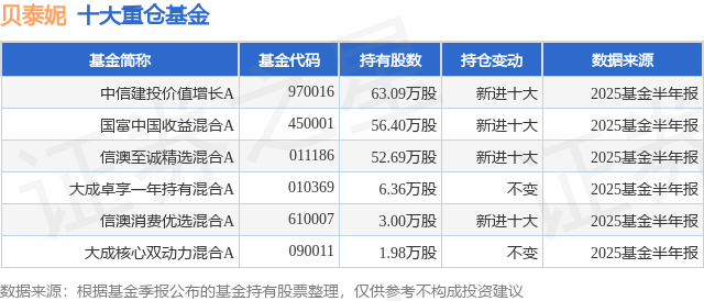 根据2025基金半年报公募基金重仓股数据,重仓该股的公募基金共6家,其中持有数量最多的公募基金为中信建投的中信建投价值增长A。中信建投价值增长A目前规模为6.98亿元,最新净值1.139(9月5日),较上一交易日上涨2.53%,近一年上涨39.11%。该公募基金现任基金经理为张燕。