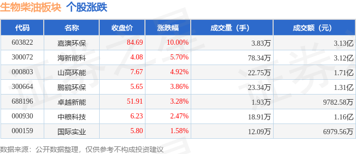 证券之星消息,9月8日生物柴油板块较上一交易日上涨4.5%,嘉澳环保领涨。当日上证指数报收于3826.84,上涨0.38%。深证成指报收于12666.84,上涨0.61%。生物柴油板块个股涨跌见下表:
