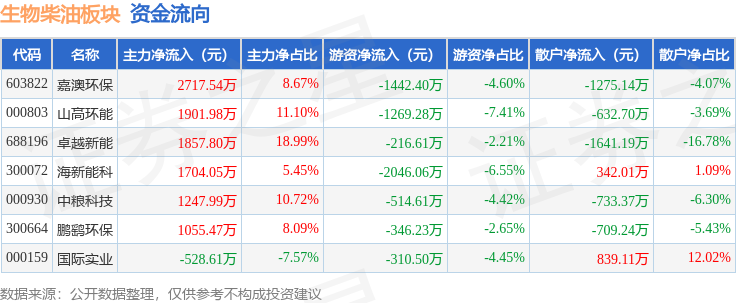从资金流向上来看,当日生物柴油板块主力资金净流入9956.22万元,游资资金净流出6145.7万元,散户资金净流出3810.53万元。生物柴油板块个股资金流向见下表: