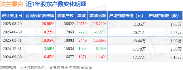 从股价来看,2025年6月30日至2025年8月29日,法兰泰克区间涨幅为26.86%,在此期间股东户数增加2.08万户,增幅为116.21%。