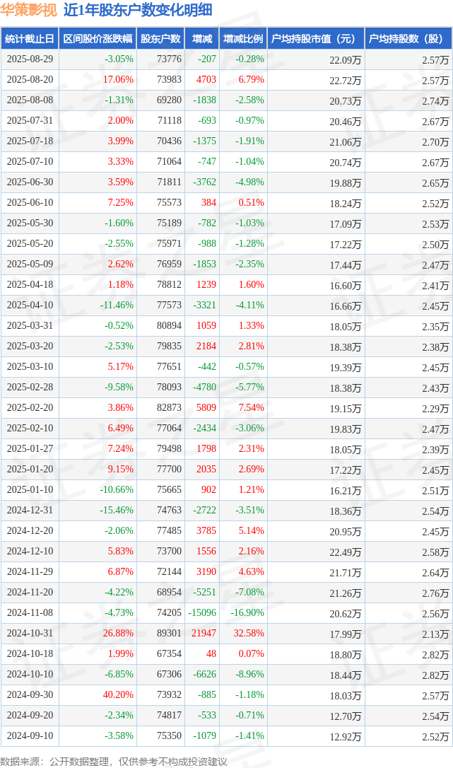 从股价来看,2025年8月20日至2025年8月29日,华策影视区间跌幅为3.05%,在此期间股东户数减少207.0户,减幅为0.28%。