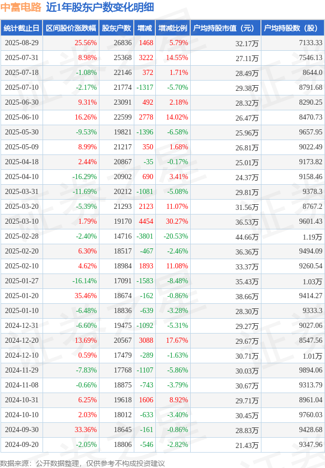 从股价来看,2025年7月31日至2025年8月29日,中富电路区间涨幅为25.56%,在此期间股东户数增加1468.0户,增幅为5.79%。