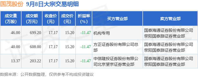 证券之星消息,9月8日国茂股份发生大宗交易,交易数据如下: