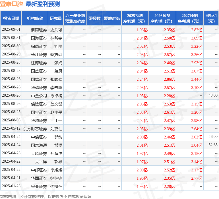中长期看,在口腔护理行业“专业化、高端化”趋势下,公司依靠抗敏领域龙头地位与全品类布局,有望进一步提升市场份额。根据25年中报情况,我们调整盈利预测,预计25-27年归母净利为2.0亿/2.5亿/3.2亿(25-27年前值为2/2.5/3.1亿),对应PE分别为36X/29X/23x。