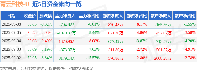 证券之星消息,截至2025年9月8日收盘,青云科技(688316)报收于69.85元,下跌0.82%,换手率3.2%,成交量1.53万手,成交额1.07亿元。