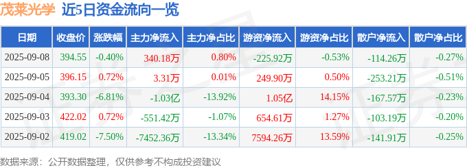 证券之星消息,截至2025年9月8日收盘,茂莱光学(688502)报收于394.55元,下跌0.4%,换手率6.47%,成交量1.09万手,成交额4.26亿元。