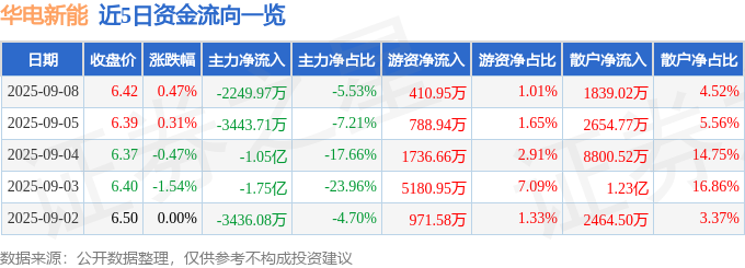 证券之星消息,截至2025年9月8日收盘,华电新能(600930)报收于6.42元,上涨0.47%,换手率2.53%,成交量63.44万手,成交额4.07亿元。