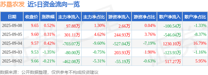 证券之星消息,截至2025年9月8日收盘,苏垦农发(601952)报收于9.65元,上涨0.52%,换手率0.57%,成交量7.84万手,成交额7557.6万元。