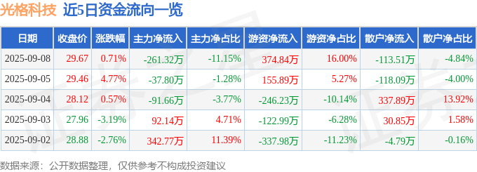 证券之星消息,截至2025年9月8日收盘,光格科技(688450)报收于29.67元,上涨0.71%,换手率1.63%,成交量7963.0手,成交额2343.04万元。