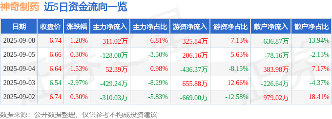 证券之星消息,截至2025年9月8日收盘,神奇制药(600613)报收于6.74元,上涨1.2%,换手率1.42%,成交量6.81万手,成交额4569.65万元。