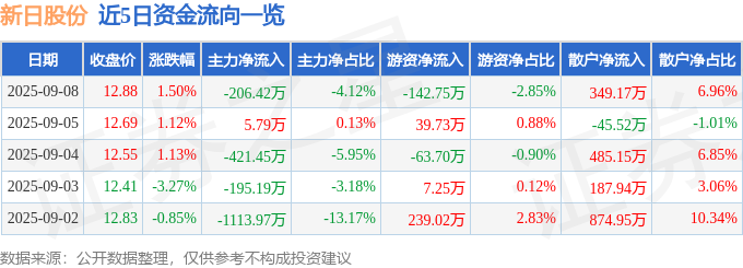 证券之星消息,截至2025年9月8日收盘,新日股份(603787)报收于12.88元,上涨1.5%,换手率1.7%,成交量3.92万手,成交额5014.97万元。