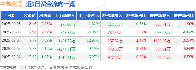 证券之星消息,截至2025年9月8日收盘,中盐化工(600328)报收于8.16元,上涨2.26%,换手率1.72%,成交量25.24万手,成交额2.04亿元。