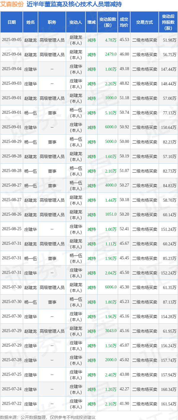 艾森股份近半年内的董监高及核心技术人员增减持详情如下: