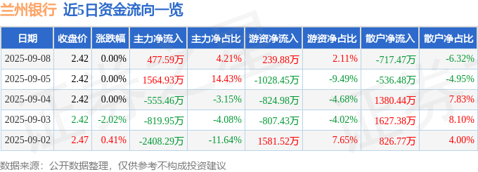 证券之星消息,截至2025年9月8日收盘,兰州银行(001227)报收于2.42元,上涨0.0%,换手率1.11%,成交量46.93万手,成交额1.13亿元。