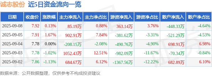 证券之星消息,截至2025年9月8日收盘,诚志股份(000990)报收于7.92元,上涨0.13%,换手率1.01%,成交量12.23万手,成交额9663.48万元。
